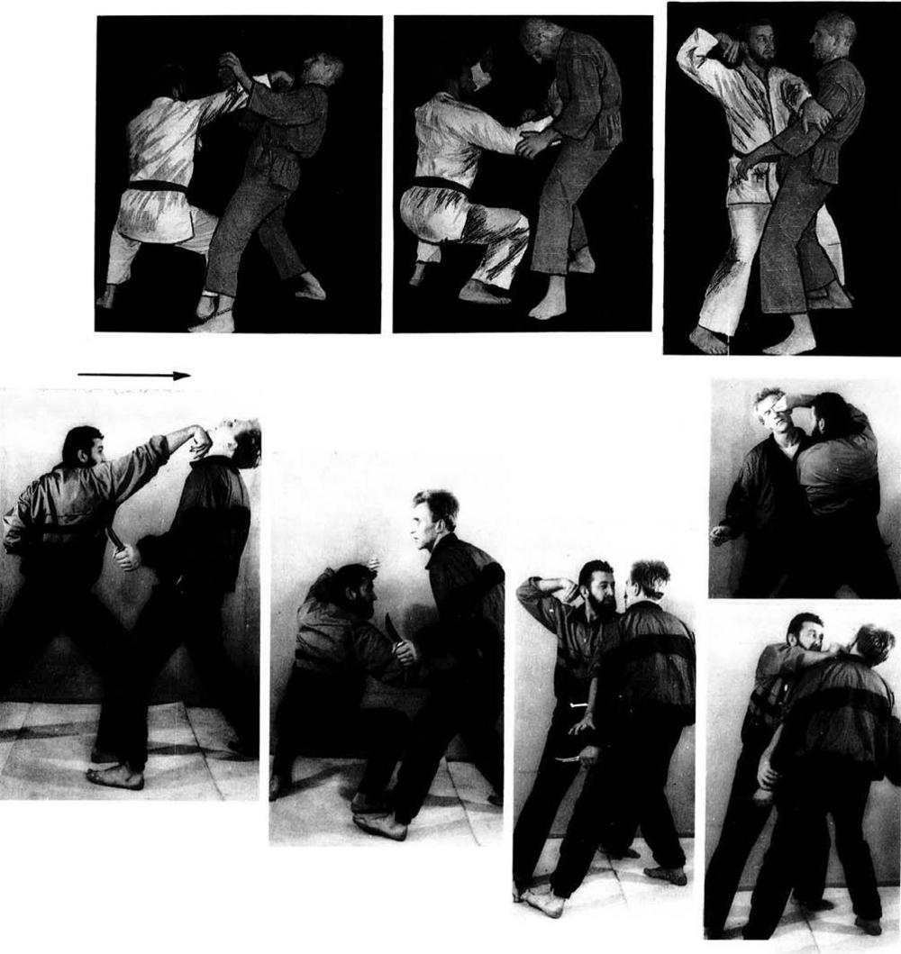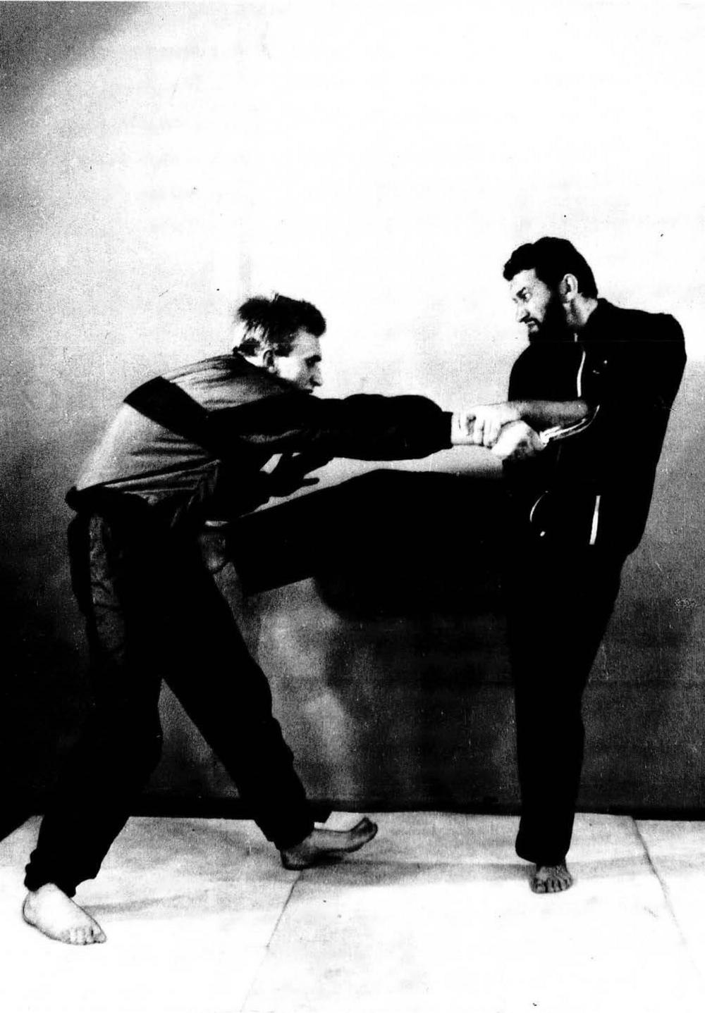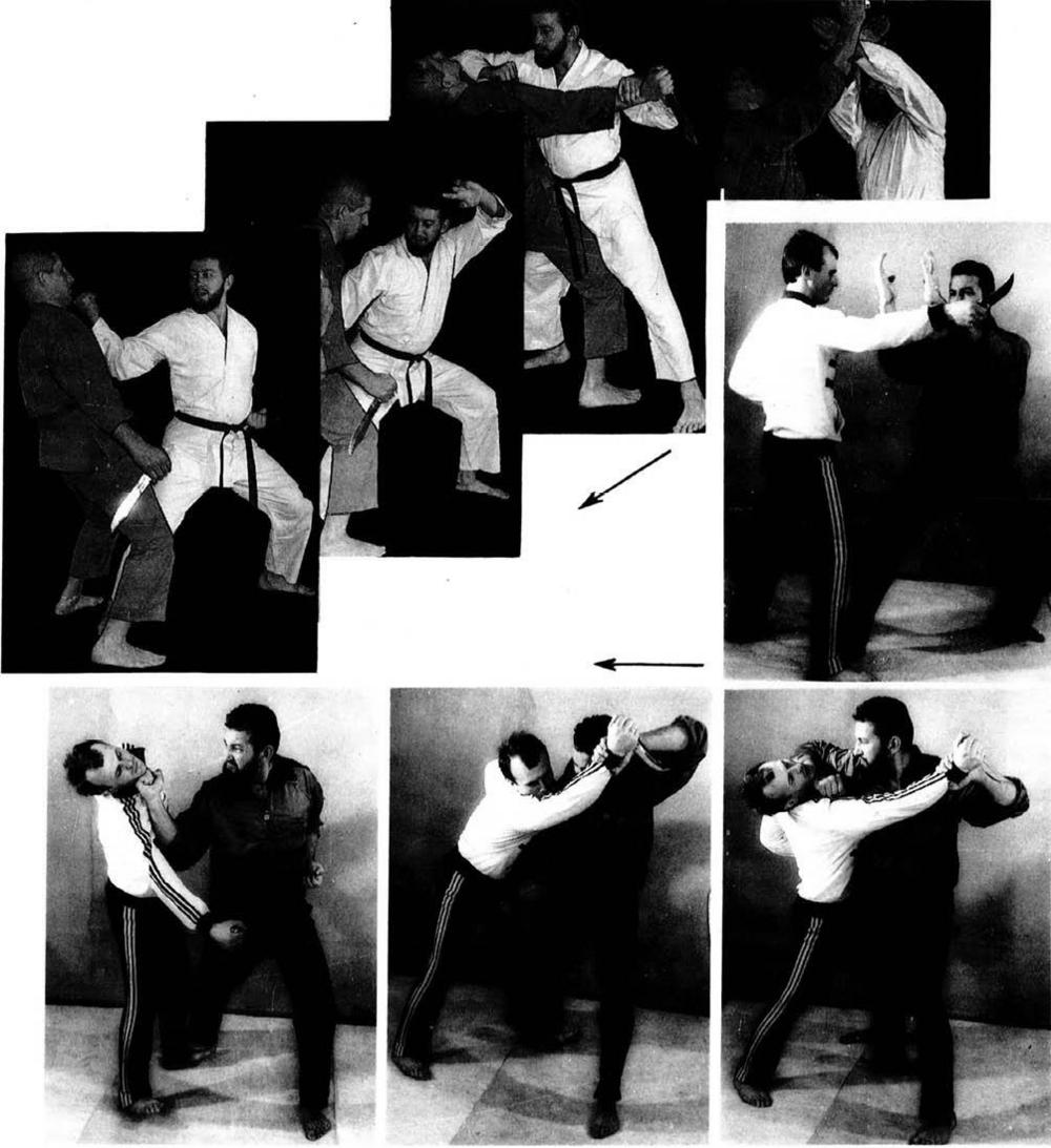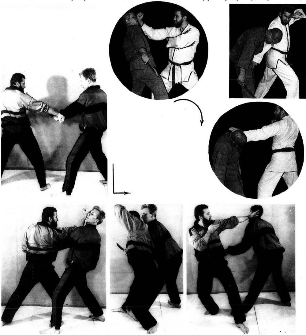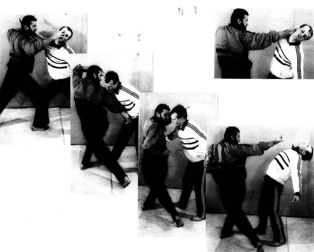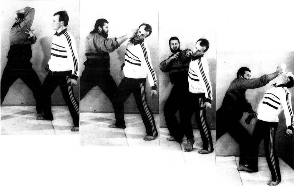 От двух хлестких ударов правой кистью "бара-тэ" по глазам сначала снаружи вовнутрь, а затем изнутри наружу, по дуге сверху вниз перейдите к удару "шуто-барай" в пах и, присев, кистью этой же руки выбросите снизу вверх удар "уракен-учи" в подбородок противника (или "шуто-учи" по шее).