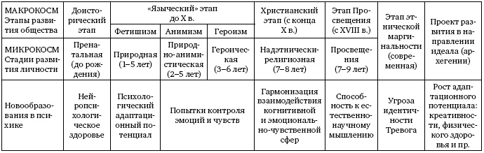 В таблице наглядно представлены аналогия этапов развития коллективного субъекта (общества) (подробнее см. главу 3) и стадий развития индивидуального субъекта (личности) на примере русской этносреды, эмпирически установленные оптимальные периоды начала той или иной стадии и психологические новообразования, возникающие в итоге прохождения каждой стадии развития личности.