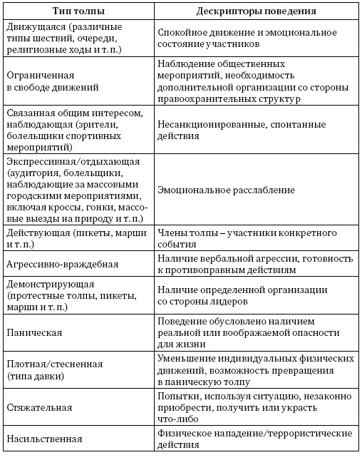 Например, в Англии матрица для оценки возможностей правоохранительных структур при обеспечении безопасности массовых мероприятий включает профиль состава толпы как совокупность ряда индикаторов (Health and Safety Executive, 1999). Основные дескрипторы массового группового образования включают параметры участия семейных групп, молодых людей, детей и подростков, пожилых людей и, что очень важно, представителей конкурирующих групп. В руководстве, разработанном Австралийской ассоциацией управления чрезвычайными ситуациями, описаны типы толп в условиях массовых скоплений людей с выделением ключевых дескрипторов, включающих физические движения, степень участия, формы поведения (Australia, 1999) (см. таблицу 1).