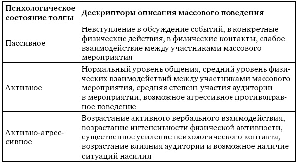 Состояние сознания толпы характеризовалось как пассивное, активное и энергетическое (активно-агрессивное) (см. таблицу 2).