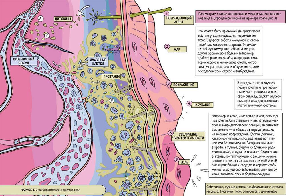 Рассмотрим стадии воспаления и механизмы его возникновения в упрощенной форме на примере кожи (рис. 1).