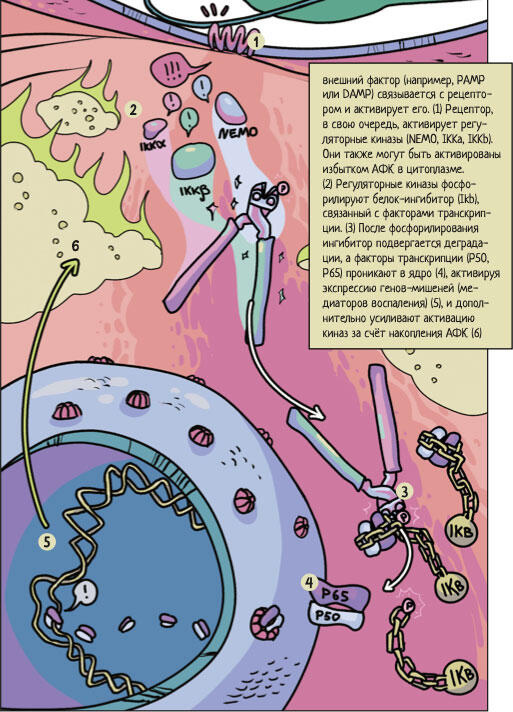 Внешний фактор (например, PAMP или DAMP) связывается с рецептором и активирует его (1). Рецептор, в свою очередь, активирует регуляторные киназы (NEMO, IKKa, IKKb). Они также могут быть активированы избытком АФК в цитоплазме (2). Регуляторные киназы фосфорилируют белок-ингибитор (Ikb), связанный с факторами транскрипции (3). После фосфорилирования ингибитор подвергается деградации, а факторы транскрипции (P50, P65) проникают в ядро (4), активируя экспрессию генов-мишеней (медиаторов воспаления) (5) и дополнительно усиливая активацию киназ за счет накопления АФК (6)9.