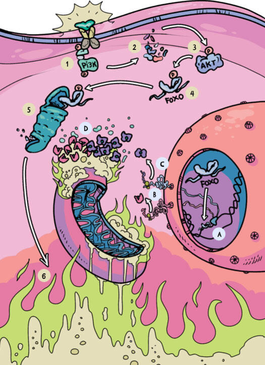 1 инсулин, связываясь с рецептором, фосфорилирует PIK3; 2 запуск каскада реакций; 3 фосфорилирование АКТ; 4 фосфорилированн АКТ фосфорилирует FOXO, подготавливая его к протеолизу; 5 протеолиз FOXO; 6 в отсутствие FOXO происходит накопление АФК; (А) FOXO инициирует транскрипцию РНК, кодирующих каталазу (В) и MnSOD (С); (D) каталаза и MnSOD инактивируют АФК11.