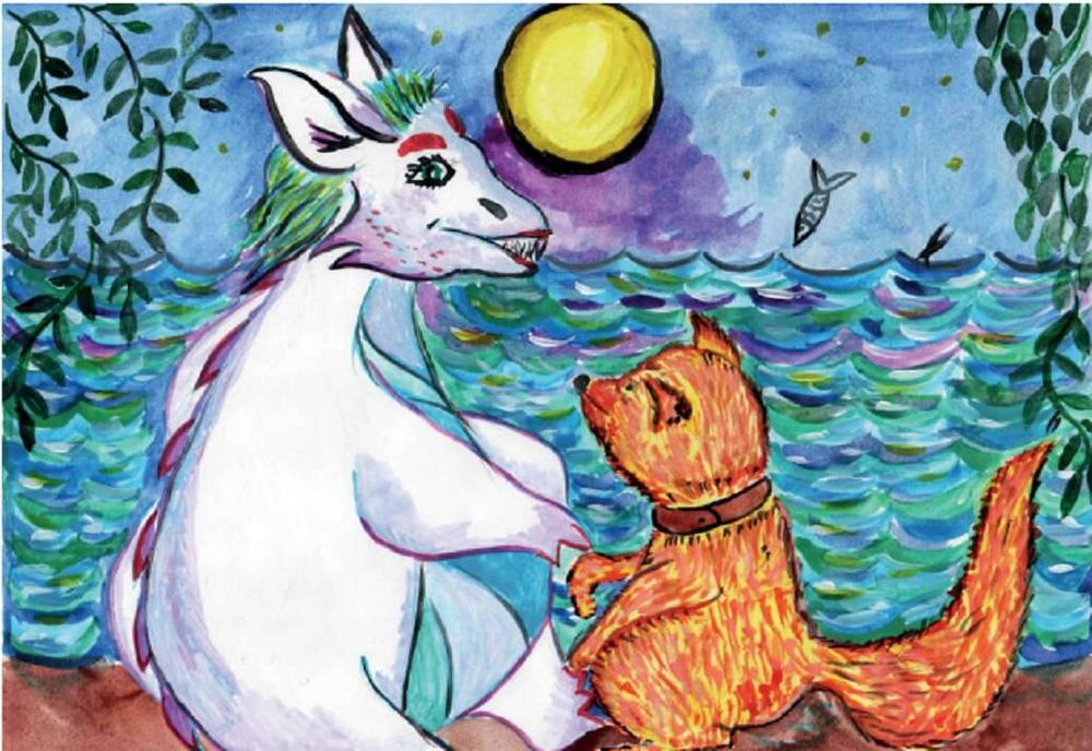 В сосуде была белая жидкость, похожая на молоко. Собачка выпила содержимое. Чернильница наполнилась снова. Собака протянула ее другу. Дракон тоже выпил жидкость. Друзья взялись за лапы, закрыли глаза и дружно прошептали:
