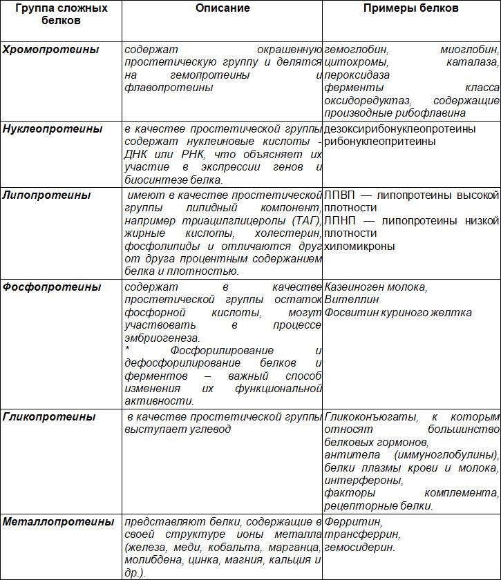 Белки условно подразделяют на простые (при гидролизе образуют смесь аминокислот) и сложные, или конъюгированные (состоят из белкового и небелкового компонентов). В качестве небелковой части (простетической группы) сложных белков могут выступать различные химические соединения, что находит отражение в классификации данной группы биологических соединений.