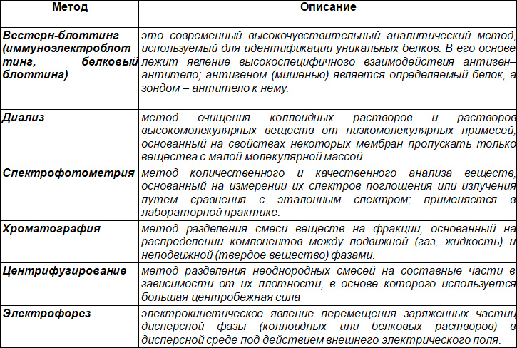 Таблица 6. Методы очистки и анализа белков и аминокислот