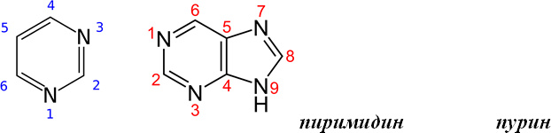 Гетероциклы, лежащие в основе структуры азотистых оснований:К пуриновым азотистым основаниям относят аденин (6-аминопурин) и гуанин (2-амино-6-гидроксипурин).