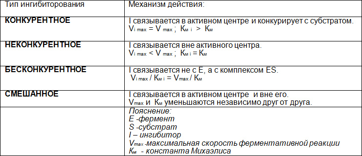 Конкурентное ингибирование подавление скорости ферментативной реакции веществами, структурно сходными с субстратом. В этом случае, ингибитор связывается с активным центром фермента и вытесняется из него при повышении количества вступающего в реакцию субстрата; ингибирование характеризуется увеличением константы Михаэлиса (КM) без изменения максимальной скорости реакции (Vmax).