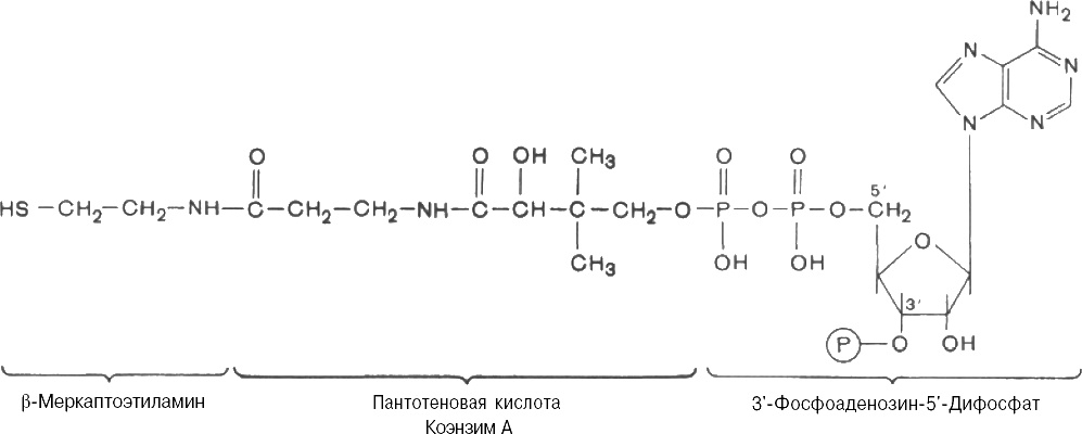 Кофермент А (коэнзим A, HS-KoA) кофермент нуклеотидной природы, соединение, состоящее из 3'-аденозин-5' дифосфата, пантотеновой кислоты и β-меркаптоэтиламина; участвует в активации ацильных радикалов.