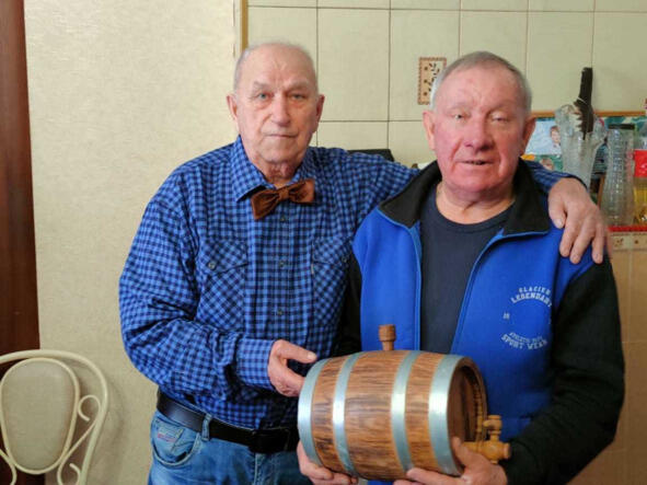 Миша Легких 25 января 2021 года. Он в бабочке. С Анатолием Вдовиченко, «Пупиком», которому 74 года. Бочонок с наливкой это для меня и моего брата, Славика.