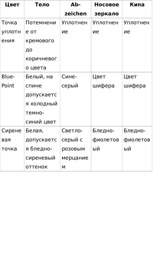 Основные цвета Seal (черно-коричневый), Chocolate (шоколадно-коричневый) и Red (оранжево-красный) также встречаются в так называемом разбавлении. Тюль становится светло-серым тоном Голубой, Шоколад светло-ледяным серым цветом Сиреневый, а Красный нежным Кремовым. Разбавление происходит потому, что краситель слипается.