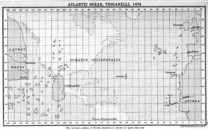 Предположительно проект Колумба опирался на переписку с крупным итальянским ученым Паоло Тосканелли, который выполнил расчеты примерных размеров Земли. То, что Земля шар, в XV веке было уже очевидно, хотя в прошлом столетии за эту мысль еще сжигали на кострах. Идея Колумба состоит в том, что, если плыть все время на запад, окажешься в конце концов на востоке в Китае или Японии.