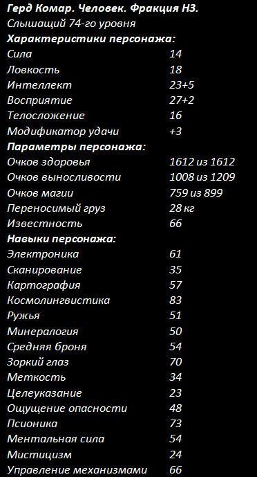 Да, тут можно было оправдываться, что произошла смена игрового класса, а Слышащий скорее завязанный на управление механизмами маг, чем классический стрелок или указывающий цели разведчик. Но это вовсе не перечёркивало того тревожного факта, что на стрельбище Комар действительно давно не был и сильно запустил это направление развития. С псионическими навыками дела обстояли чуть лучше, но тоже далеко не «в полтора раза выше уровня персонажа», так что в этом направлении тоже предстояло ещё работать и работать.
