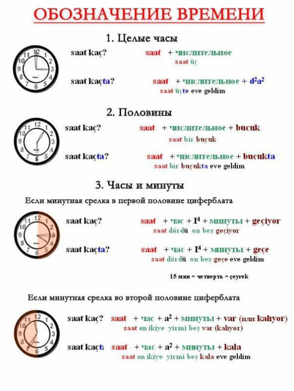 Переведите на турецкий язык время на часах.