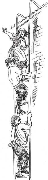 Немного ниже её, на пожарной лестнице, стоял человек с бледным лицом и протягивал к ней то одну, то другую руку.