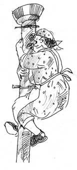 На пожарной лестнице, почти под самой крышей, стояла маленькая старушка. Белые волосы выбились из-под платка с розовыми цветочками. Голубые глаза горели. А сатиновый передник развевался по ветру, как пиратский флаг.