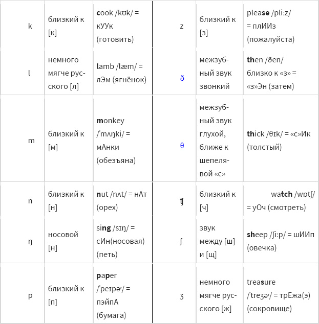 Согласные звукиОбратите внимание на то, что в каждой транскрипции присутствует значок «» такая маленькая запятая-апостроф наверху. Он нам нужен для того, чтобы знать, на какой слог падает ударение в слове. Вернитесь, пожалуйста, к табличкам и рассмотрите внимательнее апостроф ставится перед ударным слогом.