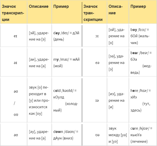 Дифотонги (в слове 2 звука, которые могут образовываться с помощью одной или двух гласных букв):