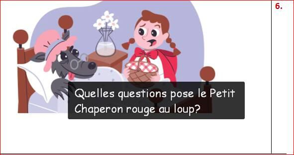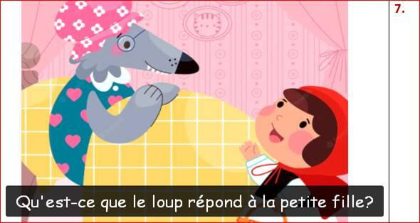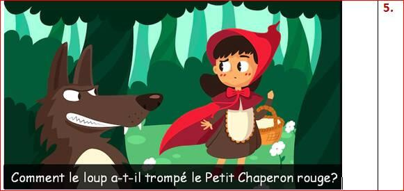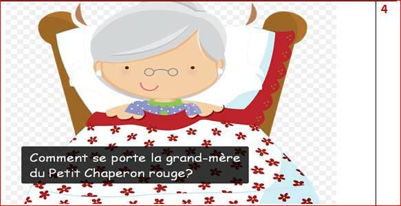 Le Petit Chaperon rouge sest déshabillée et sest couchée. Elle a trouvé que sa grand-mère était un peu bizarre. Elle lui a dit :