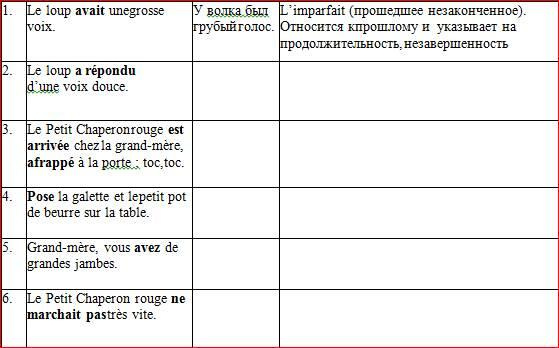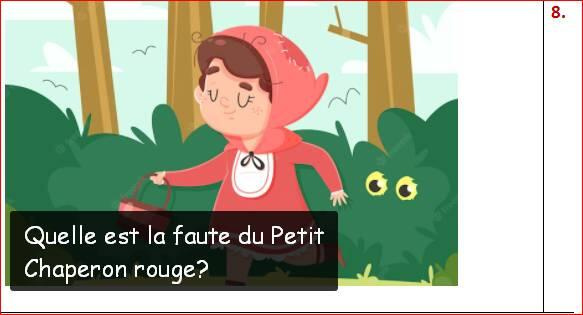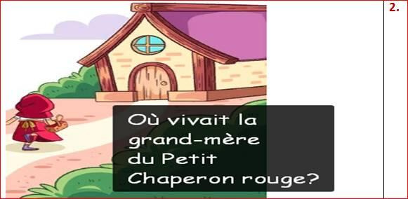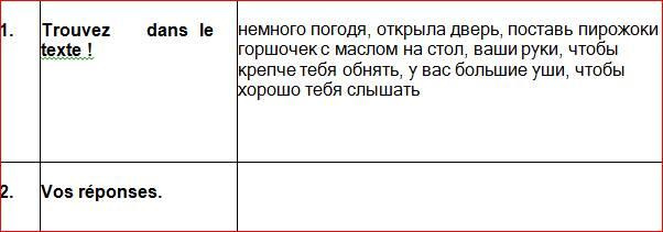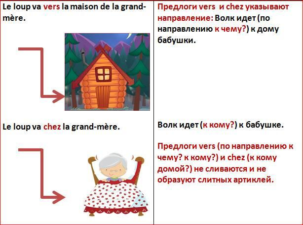 1. Le Petit Chaperon rouge est partie___ sa grand-mère. 2. Elle va voir ___sa grand-mère. 3. Le loup est arrivé le premier à la maison ___ la grand-mère. 4. Le loup a peur des haches (une hache топор) ___ bûcherons. 5. Le Petit Chaperon rouge est arrivée ___ sa grand-mère. 6. Le loup va ___le lit ___la grand-mère. 7. Les bras ___loup sont grands.