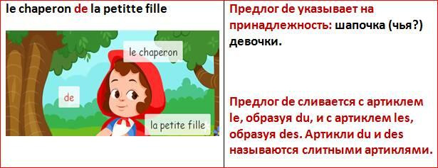 Предлог de указывает на принадлежность: шапочка (чья?) девочки. Предлог de сливается с артиклем le, образуя du, и с артиклем les, образуя des. Артикли du и des называются слитными артиклями.