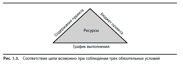 Успешным является проект, который соответствует требованиям всех лиц, участвующих в его реализации. У каждого проекта есть цель. Цель достигается при соблюдении трех граничных условий, как показано на рис. 1.3. Содержание проекта проектное задание это описание того, чего как минимум мы хотим достичь по завершении проекта, каков желаемый результат. Бюджет проекта и график выполнения максимум того, что мы готовы на это потратить. В центре ресурсы, они связаны с каждым из трех необходимых условий и влияют на них и на успешность реализации проекта.