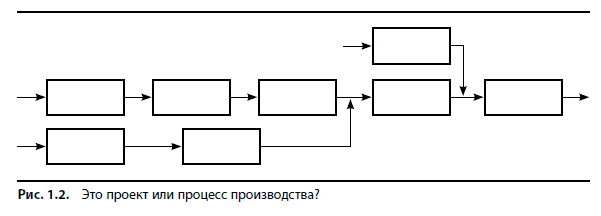 Иногда, чтобы отличить проекты от обычного производства, смотрят на количество получаемой продукции и на относительную длительность операций. При реализации проектов обычно возникает результат в своем роде уникальный. В ходе производства же появляется значительное количество более-менее похожих единиц продукции. Некоторое пересечение есть между проектом и изготовлением под конкретные пожелания заказчика (например, сборка автомобиля на заказ). Как я обнаружил, многие считают, что стандартное производство и проекты совершенно разные вещи. В середине 1990-х я первый раз услышал о теории ограничений систем ТОС, впервые описанной доктором Элияху Голдраттом в книге «Цель» (The Goal) [2]. Порекомендовав роман нескольким менеджерам проектов и программ, выяснил, что никто не видел никакой связи между ТОС и управлением проектами. Впоследствии я нашел способ преодолеть власть традиционной парадигмы мышления. Показывая людям рис. 1.2, я спрашиваю: «Что это проект или процесс производства?» Реакция аудитории очень интересная. В большинстве случаев вид у всех озадаченный. Быстрого ответа не дает никто. Затем один предполагает: «Может быть, и то, и то». Остальные сразу соглашаются. На самом деле может быть и так, и так. На этом уровне сходства очевиднее различий. Поэтому в первую очередь мы с вами проанализируем такую общую черту проектов и производства, как вариабельность длительности отдельных операций. Речь идет об операциях, преобразующих некие входные параметры в результаты на выходе; из таких операций состоят как взаимозависимые этапы производственного процесса, так и этапы реализации любого проекта.