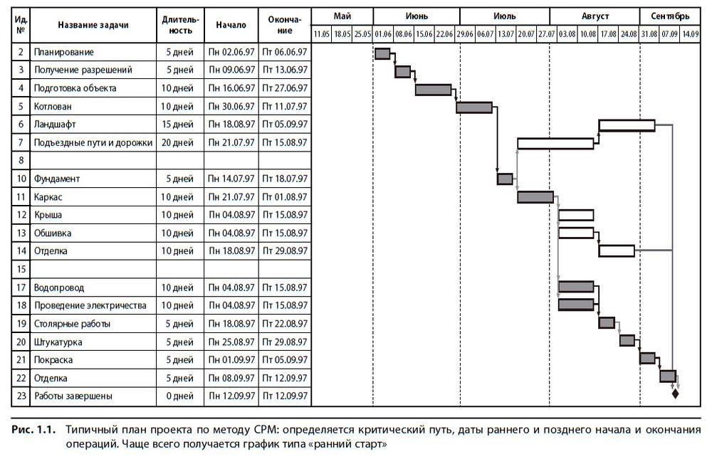 Большинство программных продуктов и абсолютно все приложения, которые мне встречались, в рамках СРМ настроены на создание графика типа «ранний старт». Это означает, что программа составит расписание работ таким образом, чтобы они начинались как можно раньше и помещались на графике как можно левее. На рис. 1.1 дан типичный план проекта, построенный таким образом.