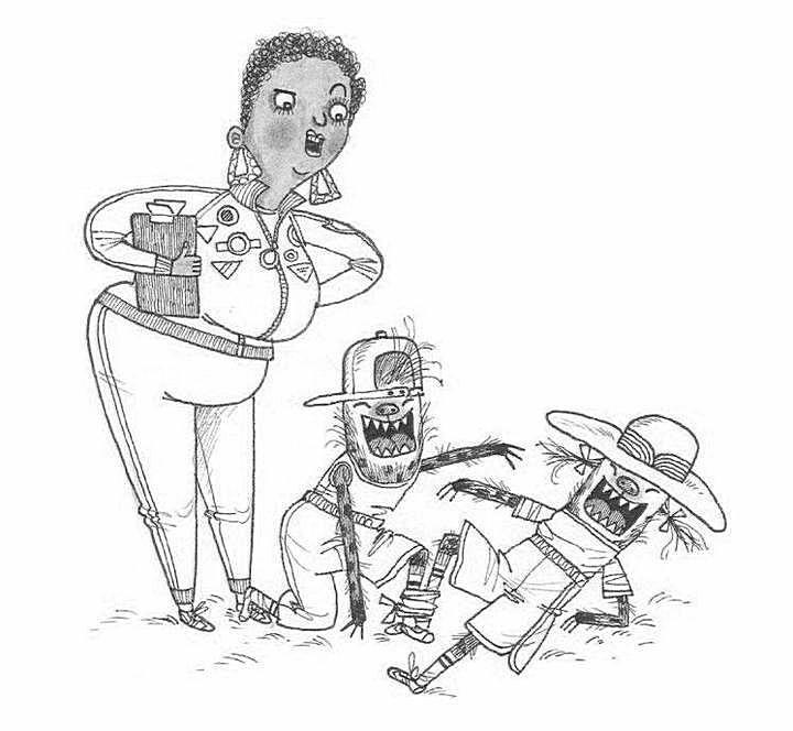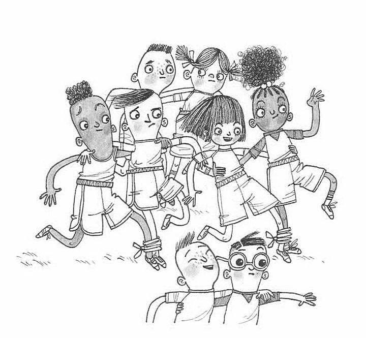 Раздался пронзительный свист, и Гонка-на-трёх-ногах началась. В ней участвовали десять пар детей, левая нога одного была привязана к правой другого. Они делали всё возможное, чтобы пробежать хорошо, но удавалось всем очень по-разному. Толпа салютовала и вытягивала шеи, желая лучше разглядеть спортсменов.