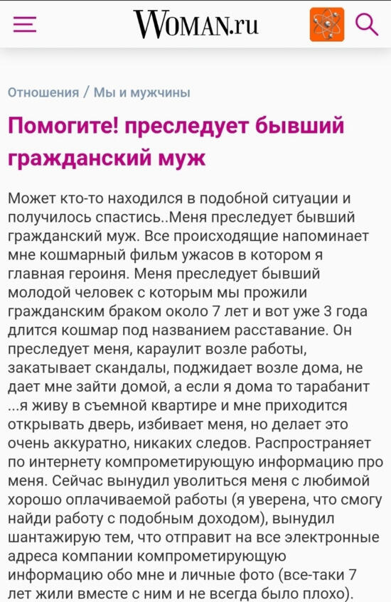 Но проблема в том, что у гражданского брака нет начала: непонятно, в какой день этот брак «заключен». Как следствие, непонятно, когда этот брак прекращается. И что делать, если один из гражданских супругов стал считать другого бывшим супругом, а этот другой супруг отказывается считать себя таковым (см. скриншот сайта woman.ru далее).