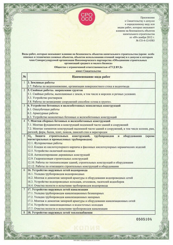 Приложение к свидетельству на допуск к работам ООО «Гуд Вуд».