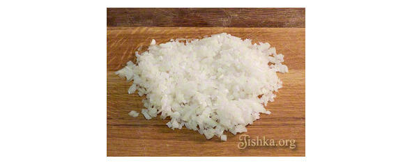 Репчатый лук очень мелко нарезать, чем мельче тем лучше. Можно натереть на терке.
