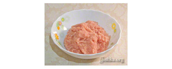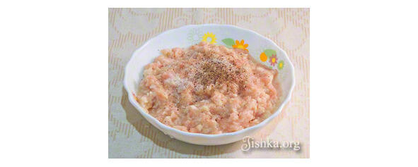 При помощи мясорубки или измельчителя сделать из куриных грудок фарш. (Если Вам попались водянистые грудки и фарш получился жидковат воды добавлять не нужно).