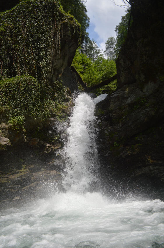 Один раз потеряли метки и выскочили к горе. Дальше тропинки не было, мостика тоже. Я, привыкший к таким передрягам, быстренько вычислил крупные валуны по которым перескочил на другой берег. Однако повторить этот фокус, Лиза отказалась. Тут, как мимо Миронова в Бриллиантовой руке, мимо меня прошла семья с детьми, которую недавно обогнали. Всё сразу стало на свои места, и мы вернулись чуть вниз к переправе. И вот из за поворота показался Гургенианский водопад (41.897614, 46.267693). Мощный и высокий, он бесновался, разбиваясь в дребезги о камни у подножия.