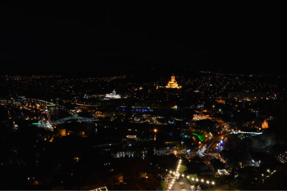 ПоБЛАГО ДАРив Небесам и мастеру, двинули на осмотр ночного Тбилиси. Для начала решили залезть к храму на горе, напротив крепости, но промазали в узких лабиринтах старого города. В итоге выскочили на шикарную смотровую прямо над центром.