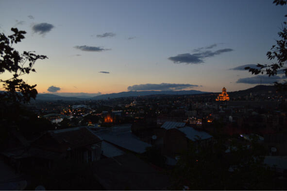 Насладились закатом и в сгущающихся сумерках спустились вниз. Прошли до нового светящегося моста Мира. Очереди на канатку почти не было, поэтому над сверкающим иллюминацией центром Тбилиси поднялись наверх к крепости. Уморенные и вчерашним и сегодняшним днём, сели на лавку с шикарным видом и насладились всей этой красотой и звуками уличного стрит-арта, игравшего рядом.