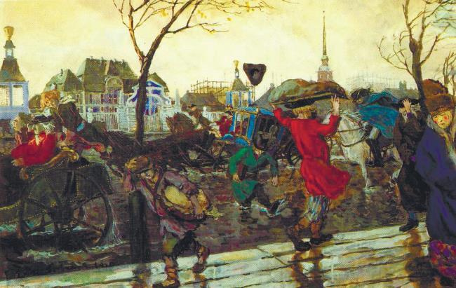Бенуа А. Н. Петербургская улица при Петре I. 1910. Б., акв., гуашь. ГМИИ. Музей частных коллекций