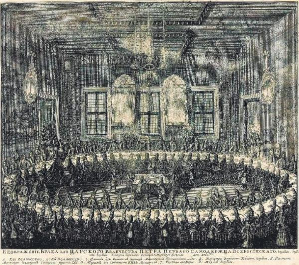 Нельзя считать документальными и событийные гравюры. Как правило, они создавались заранее и являлись частью подготовки торжества. Не случайно на гравюре «Изображение брака Его Царского Величества Петра Первогокоторый отправлен в Санкт Питеръбурге февраля 1712-го» не проставлена дата, а цифрами обозначены только обязательные участники царская чета, принцессы, Меншиков и те немногие лица, чьи места были заранее определены протоколом.