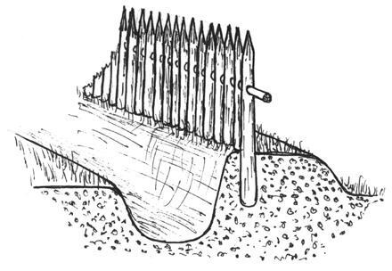 Но такое поселение на мысу было открыто с напольной стороны (фортификационный термин: сторона, выходящая на открытое поле, откуда возможна атака врага), и здесь приходилось создавать искусственные укрепления. Обычно отрывали ров, а вынутой землей насыпали вал. Если конец мыса был низменный, в виде пологого ската, то его тоже могли обносить рвом и валом. Наибольшее значение имели глубокие рвы, особенно если они были наполнены водой из реки или ручья. Валы назывались спом, приспом, переспом (от слова «сыпать»), а позднее осыпью, и как бы дополняли своими откосами крутые стенки рва. А уже на валу ставились деревянные укрепления. По краю площадки строили частокол (тын) высотой «в два копья», то есть примерно 34 метра. Бревна закапывали в землю на глубину примерно в 1 метр и для прочности их закрепляли в основании горизонтальными плахами и бревнами. На расстоянии 3050 сантиметров от заостренных верхних концов бревен их соединяли горизонтальным брусом, проходившим через отверстия в бревнах, или прибитым к ним. Таким образом, повалить отдельные бревна частокола было очень трудно, даже невозможно. Обычно на частокол шли хвойные деревья диаметром 1520 сантиметров. Пространство на валу за тыном называлось затином. С внутренней стороны тына делались полати настил боевого хода защитников, стоявший на коротких вертикальных столбах. Находившиеся на полатях защитники почти на всю высоту своего роста были скрыты тыном, стреляя из луков между заостренными концами бревен или через узкие амбразуры, прорезанные в двух смежных бревнах.