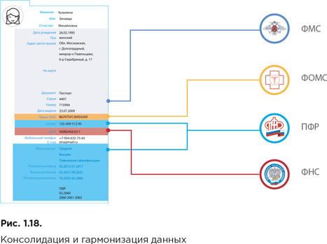 Также одна из ключевых задач создания электронной трудовой книжки задача консолидации и гармонизации всего массива данных о работнике и работодателе в одной информационной системе, позволяющей обеспечить интероперабельность и непротиворечивость собранных данных из различных информационных систем целого ряда федеральных органов исполнительной власти (рис. 1.18).