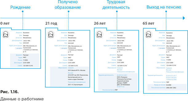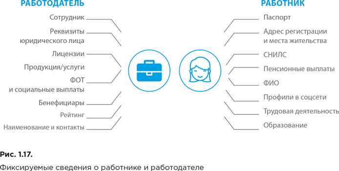 фиксируется все (образование, стаж, должность, договор, оклад, выплаты, начисления, курсы повышения квалификации и другая информация), что позволяет составить наиболее полную картину о работнике и работодателе (рис. 1.17).