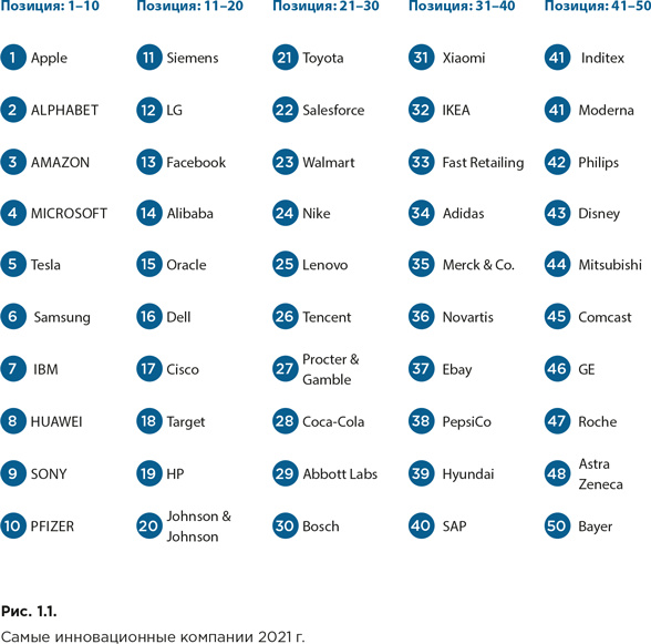 Экономическая важность высокотехнологических компаний уже сейчас оказывается основополагающей для развития мировой и национальных экономик. Из 20 крупнейших компаний мира 10 (Apple, Alphabet, Amazon, Microsoft, Alibaba, Walmart, Tencent, Johnson & Johnson, Procter & Gamble, Nestlé), по мнению Boston Consulting Group, являются самыми инновационными на планете (рис. 1.1)[19]. Вывод прост: сегодня, чтобы стать успешной компанией, необходимо быть инновационной и высокотехнологичной независимо от отрасли деятельности. Именно это становится фундаментом для развития.