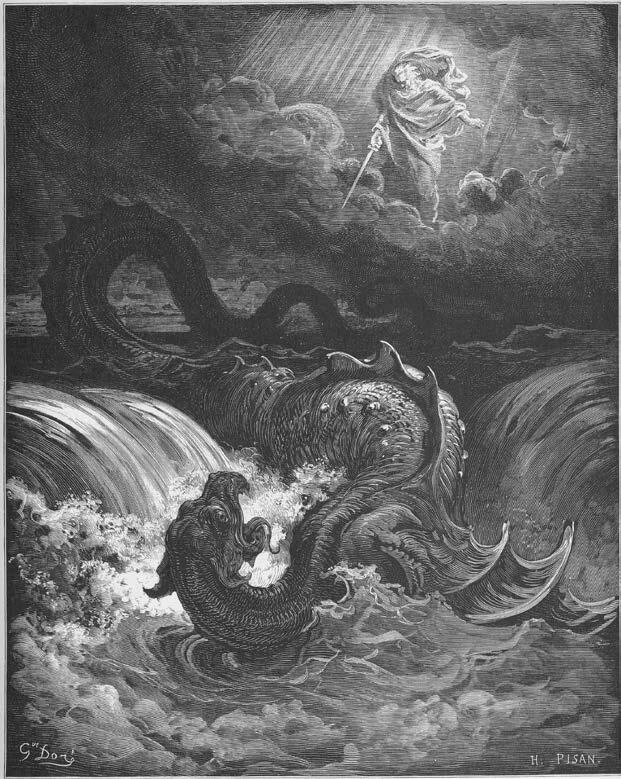 В разделе, который здесь нас особенно интересует, содержатся сведения о гигантском питоне и Левиафане морском страшилище иудеев. Первый, ныне именуемый драконом и обладающий гривой сельдяного короля, оказался в «Физиологусе» более морским, чем является на самом деле; второго же бестиарий ошибочно характеризует как рептилию.