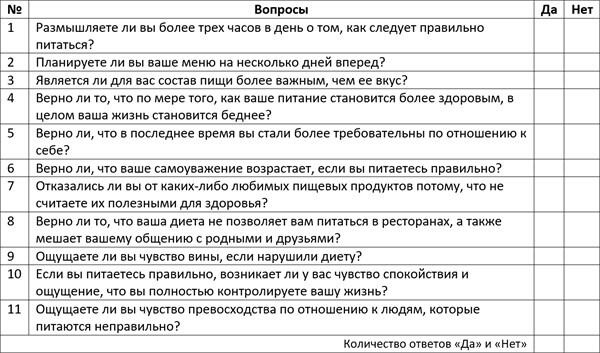 Ниже представлен опросник, который позволяет понять, является ли стремление к «правильному и здоровому питанию» гипертрофированной чертой, отражается ли это стремление на здоровье и на социальной активности человека.