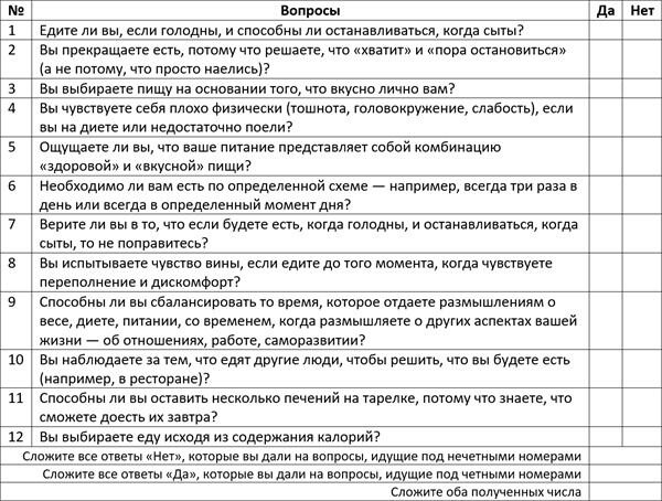Представляю еще один опросник, который позволяет понять, насколько отношения с едой подверглись социальной деформации. Проверьте, нарушена ли у вас связь между физиологической потребностью тела и приемом пищи: именно разрыв между сознанием и телом ведет к появлению нарушений пищевого поведения.