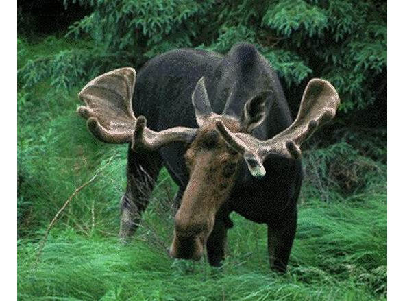 Лось, сохатый (Alces alces), парнокопытное млекопитающее; самый крупный вид семейства оленей. Длина тела самца до 3 м., высота в холке до 2,3 м., весят до 570 кг. Ноги длинные с узкими острыми копытами. Голова длинная, горбоносая, с нависающей мясистой верхней губой; уши длинные, подвижные; на горле свисает покрытый волосами кожный вырост («серьга»). Хвост короткий. У самцов имеются лопатообразные рога, направленные в стороны; самки безрогие. Шерсть грубая. На верхней стороне шеи и холки длинные волосы образуют подобие гривы. Окраска зимой темно-бурая, летом почти чёрная; ноги белые. Лось широко распространён в лесной зоне Европы (от Польши на восток) и в Азии; заходит в лесотундру, лесостепь и степь. Питается зимой побегами и корой ив, осины, рябины, сосны и других деревьев; летом поедает также травянистые растения (кипрей, пушицу, кувшинки). Длинные ноги дают возможность передвигаться в снегу глубиной до 90 см. Рога спадают в декабре, новые вырастают к августу. Лось ценное промысловое животное (используется мясо и прочная шкура), используется в тайге в качестве транспортного животного.