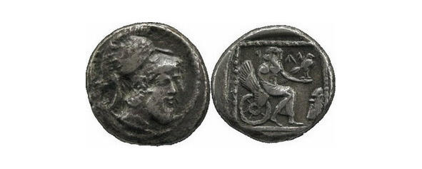 Лицевая сторона: голова Афины; оборотная сторона: сова и надпись yhd