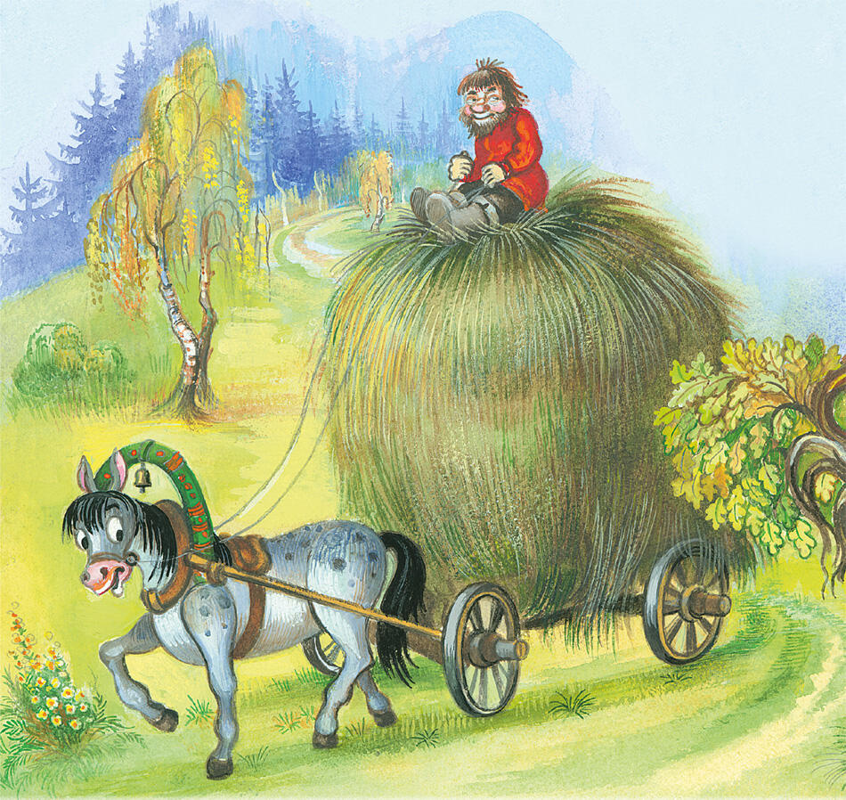 Спрятался он в кустах у лесной дороги. Смотрит, едет по дороге мужичок с возом сена. Выскочил Волк-разбойник на дорогу: в шляпе, на глазах маска и ножик в лапе! И прохрипел:
