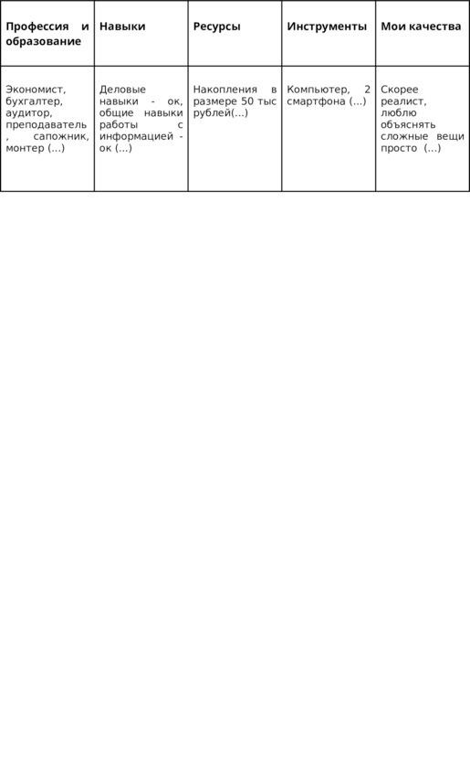 В первую очередь перечислим, с каким багажом знаний приступаем к созданию бизнеса. Давайте вспомним, где и чему учились, что смогли узнать и как это можем применять в условиях реальной жизни. Перечислим, чему нас учили в школе, после нее, в семье, в колледже или университете. Что из этих знаний вы можете использовать для заработка сегодня, именно сейчас?
