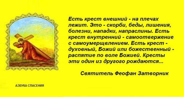Есть крест внешний на плечах лежит. Это скорби, беды, лишения, болезни, нападки, напраслины. Есть крест внутренний самоотвержение с самоумерщвлением. Есть крест духовный, Божий или божественный распятие по воле Божией. Кресты эти один из другого рождаются. Последний обозначается преданностью в волю Божию, тихою, молчаливою, упокоительною, второй борьбою с собою, безжалостною к себе, третий терпением неприятностей. Сколько крестов, столько и крестоношений. Все они неразлучны бывают до гроба, только иной раз один чувствительней, в другой раз другой или третий. Однако ж вступают они в дело или налагаются постепенно, и, быв наложены, остаются. Трисоставный крест.